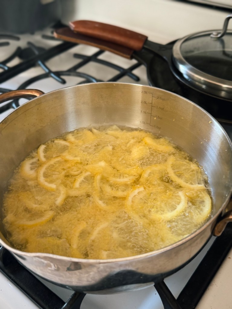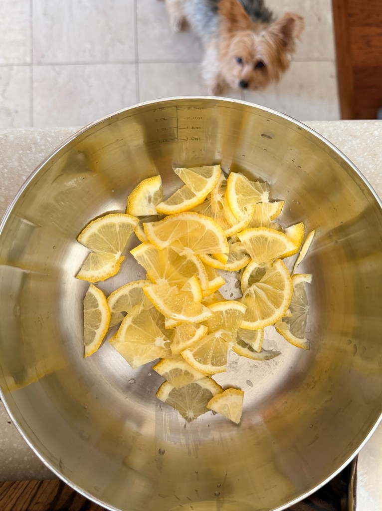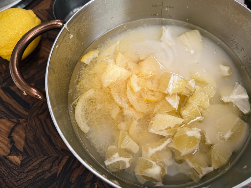 6 – Volvemos: una vez rallados los tres limones y añadidos a la olla con el limón rebanado, se agrega suficiente agua para cubrir las rebanadas y las rayaduras de limón.