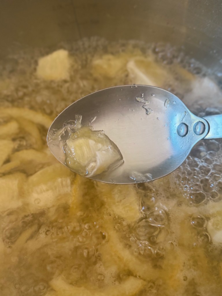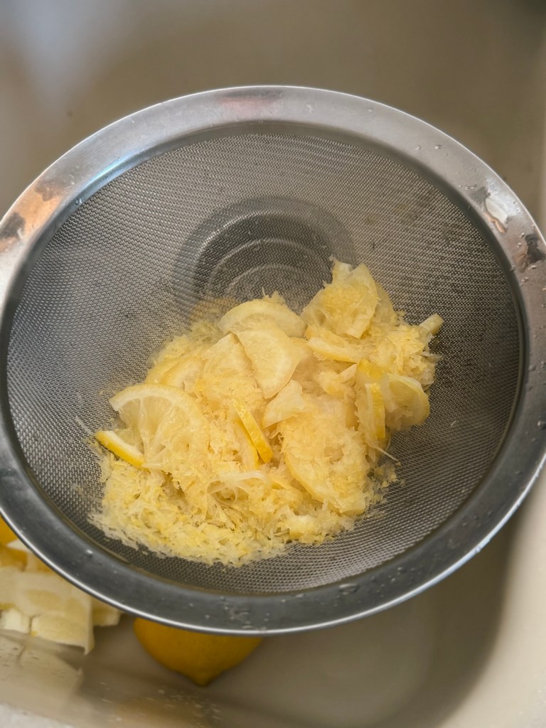 9 – Se agregan los cubos de limon a la olla una vez drenada de agua por segunda vez.